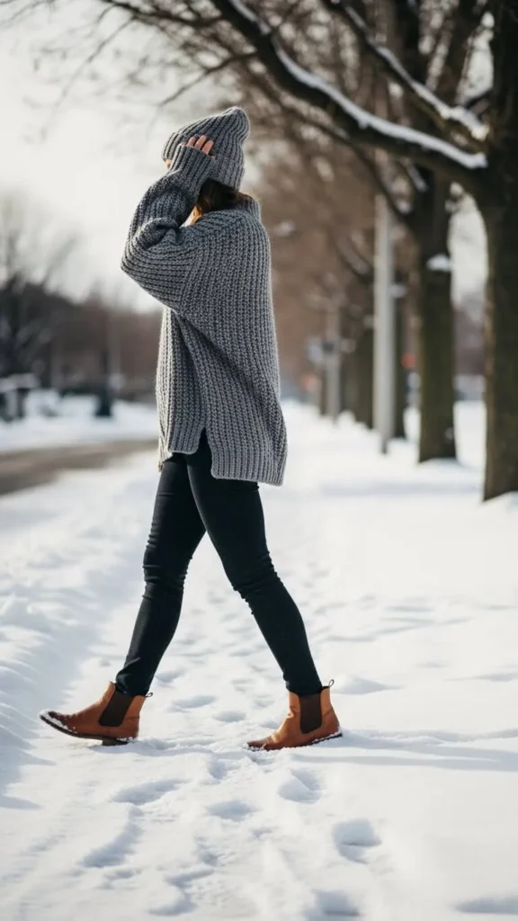 Skinny jeans and chunky knits are a simple, cozy combo. Grab a thick cable-knit sweater in neutral tones to pair with your jeans. Roll up your jeans slightly to show lace-up boots or Chelsea boots. This look feels warm and relaxed but put together. Add a scarf if you want more warmth. Bonus: sweater thrifted or DIY-ed by knitting at home keeps it budget-friendly.