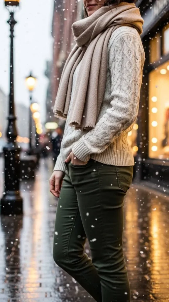 Try colored jeans like olive, burgundy, or navy with plain neutral sweaters and scarves. This adds winter color without feeling overdone. Keep the sweater simple in cut, so the jeans stand out. Scarves in soft beige, grey, or cream balance colors affordably. Colored jeans can be found in outlet stores and paired with items you already own.