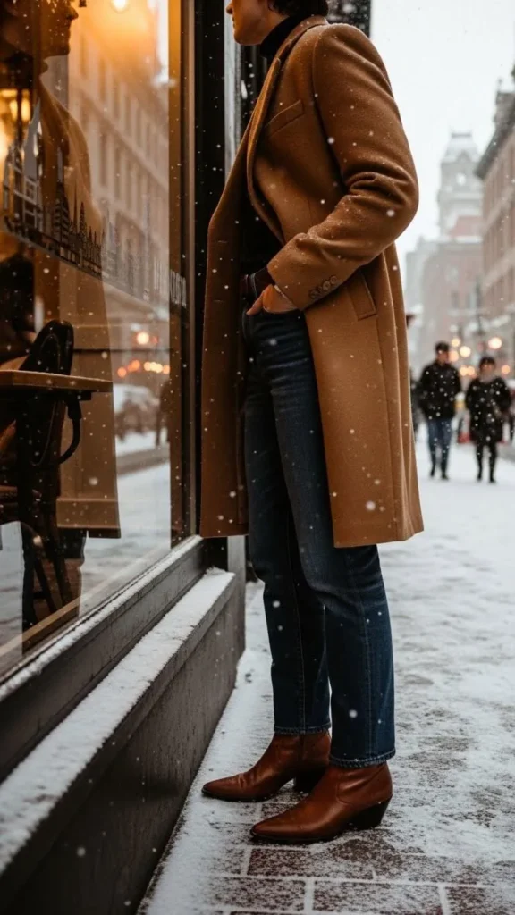 Jeans with a tailored wool coat feel ready for both office and evening outings. Pick dark wash jeans to keep the look clean. The coat adds warmth, structure, and a touch of elegance. Slip into leather boots or loafers. Keep accessories simple—a classic watch and leather bag complete the look affordably. Thrift shops often have great wool coats in excellent condition.