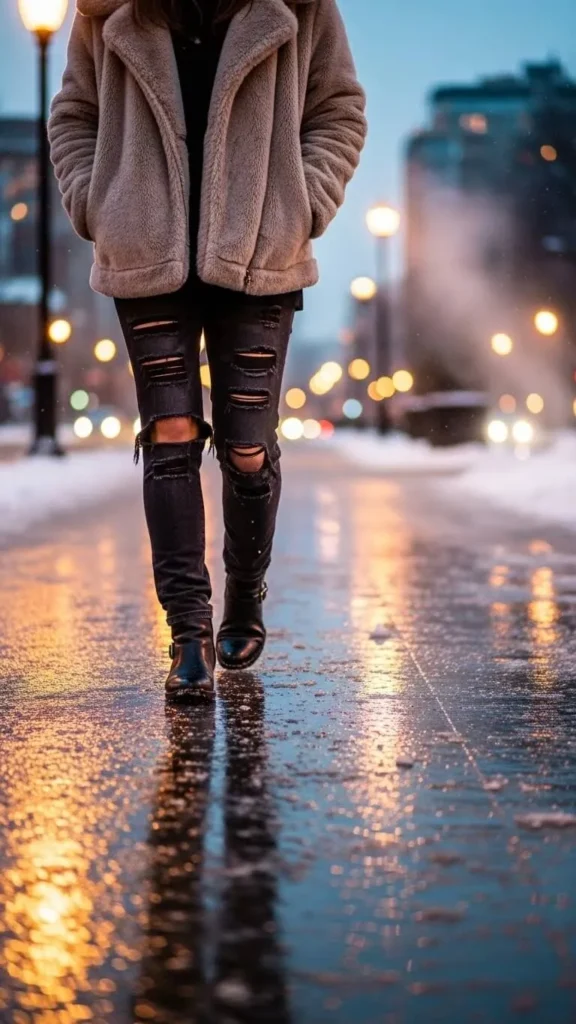 Add texture and edge this winter by teaming ripped or distressed jeans with a soft faux fur jacket. The contrast between worn denim and fluffy fur feels both trendy and tactile. Faux fur jackets come in various prices, and you can find budget options at sales or secondhand stores. Finish with sleek boots to keep feet comfy and warm.