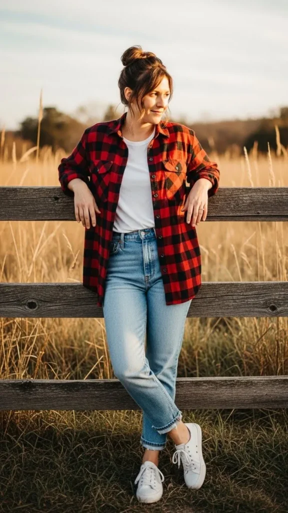 High-waisted mom jeans pair beautifully with oversized flannel shirts in winter. Leave the flannel open over a tight basic tee or tuck it in for a more defined waist. This look invites layering without feeling heavy. You can grab inexpensive flannel shirts from thrift shops—just check for softness. Slouchy mom jeans keep movement easy and comfortable all day.