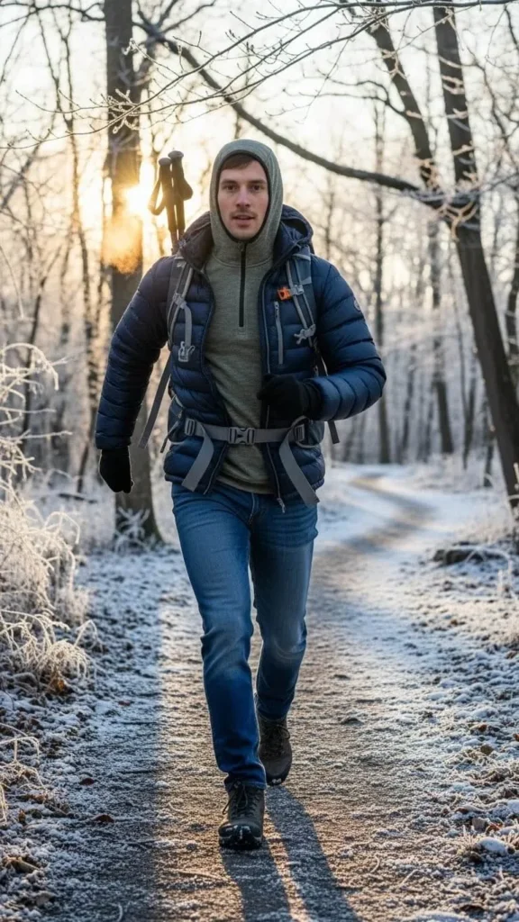 Jeans paired with a thermal hoodie and a down jacket make a practical outdoor outfit. Thermals keep warmth close to your skin, down jackets block the cold wind, and jeans add casual durability. Look for sales on thermals and purchase secondhand down jackets in good condition to save. This combo suits winter walks, errands, or outings.