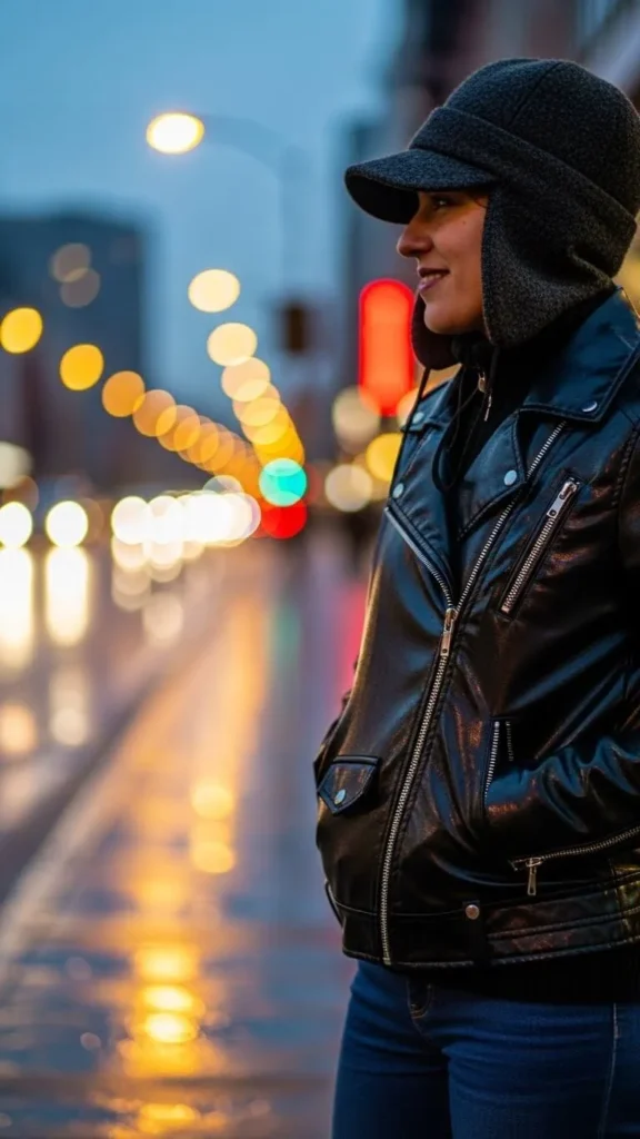 21. Jeans with Faux Leather Jacket and Wool Hat