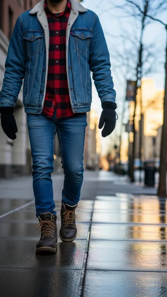 Denim jackets lined with flannel give you double warmth in one piece. Jeans keep the bottom half simple and warm. The flannel lining means you don’t need a bulky sweater underneath, saving money and layers. Keep mittens and a beanie handy, and you’re set for cold commutes or casual meet ups.