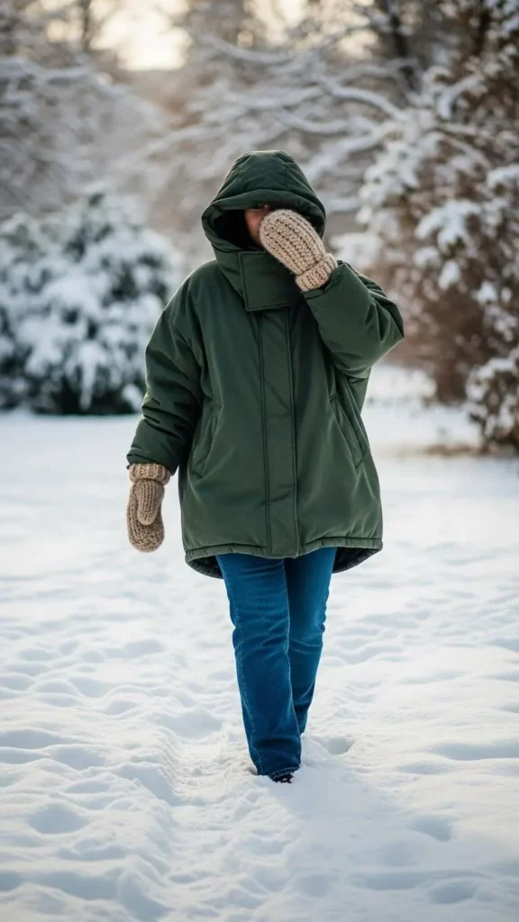 Oversized coats plus jeans make for a warm and comfortable look. Add knit mittens for extra hand protection and texture. Don’t fear mixing sizes — the coat’s volume frames your slimmer jeans nicely. Budget-wise, oversized coats are often discounted in off-season sales and mittens are easy to knit yourself if you like crafts.