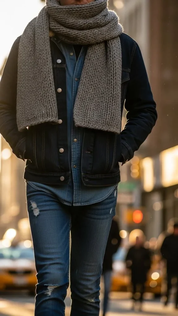 12. Jeans with a Denim Jacket and Scarf Combo