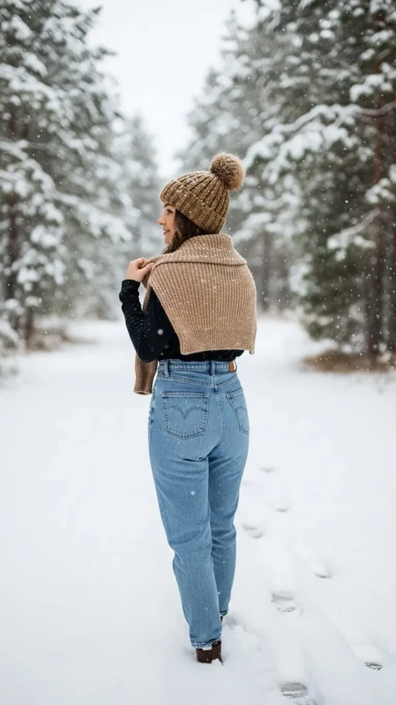 A soft slouchy sweater paired with a beanie creates an inviting, laid-back vibe with your mom jeans. Pick warm, neutral tones for the sweater that can be layered over a thin base layer. Beanies keep your head warm and add personality. Together, these pieces create a versatile outfit you can adjust when heading indoors.