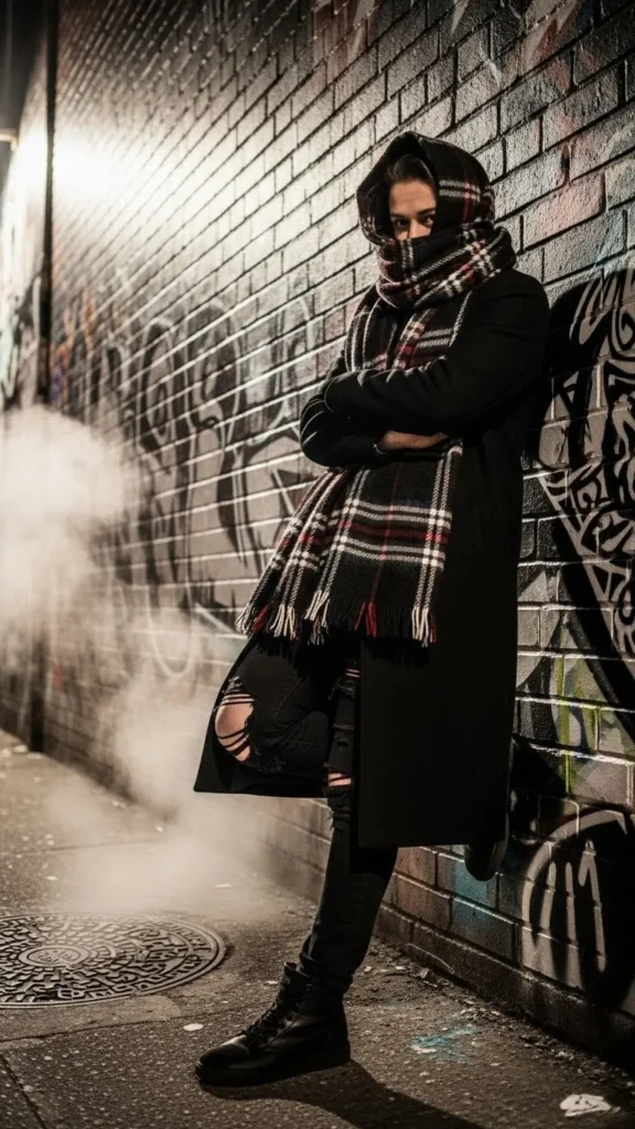 Add edge to cold days by pairing ripped black jeans with a huge plaid scarf and simple black coat. The scarf not only warms but also acts like a statement piece. Choose thick wools or blends to stay cozy. If you find a scarf too bulky, wrap it loosely without covering your face to keep airflow.
