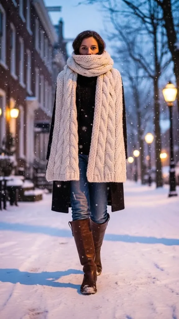 Tuck vintage-washed jeans into tall boots and wrap a big cozy knitted scarf for balanced warmth. This mix works well for casual gatherings or winter strolls. Vintage jeans can be thrifted, tall boots look high-end but find affordable options online or in clearance racks. The knit scarf can be made at home with off-the-shelf yarn kits.