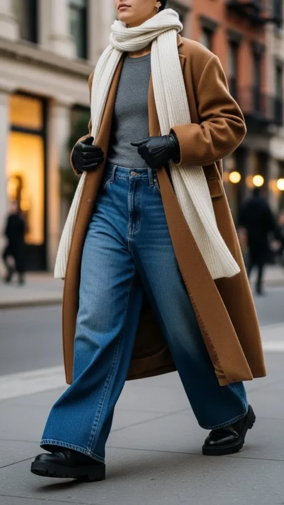 Wide leg or palazzo jeans require balancing with a fitted thermal or long sleeve shirt close to the skin. Add an overcoat that falls below the knee to maintain clean vertical lines and warmth. Gloves and a scarf pull the outfit together affordably. Layering thin underclothes saves money on heavy coats by maximizing warmth from base layers.
