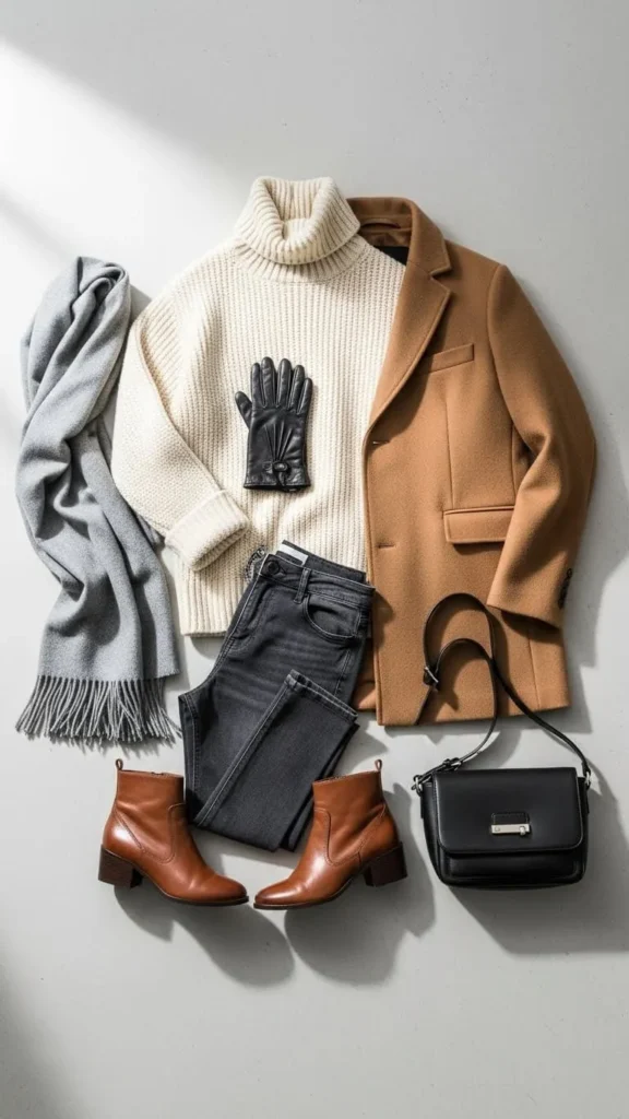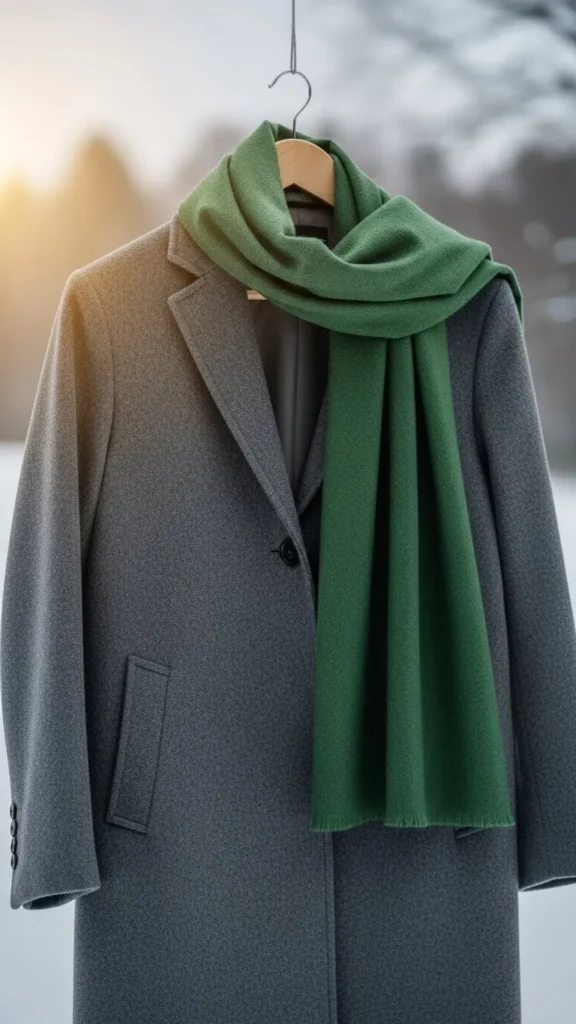 A lightweight wool coat can stay warm when paired with a soft scarf. Wrap your scarf loosely so it sits flat. Add a fitted sweater under the coat and slim trousers or jeans. Acrylic scarves can offer softness for a lower price. Gloves make windy walks more comfortable.
