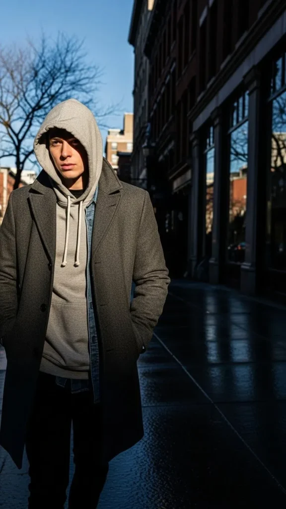 Pairing a hoodie with a structured coat adds comfort while keeping the outfit sharp. Choose a thin hoodie for a better fit. Add jeans or cargo pants and sneakers or boots. Look for coats with slightly roomy shoulders to layer without extra width.