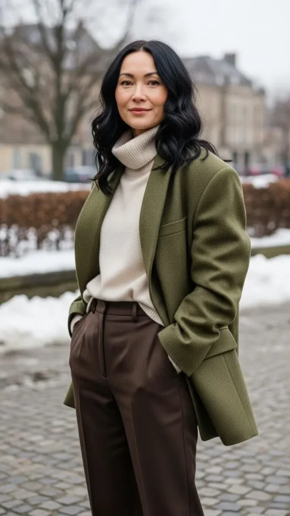 A thin turtleneck adds warmth without changing your shape. Pair it with a relaxed blazer for a clean and polished outfit. Choose a ribbed knit for comfort and pair with straight-leg trousers. Add ankle boots for a balanced look, and slip a thermal layer under the turtleneck on colder days. Thrifted wool blazers are a great low-cost option that still look sharp.