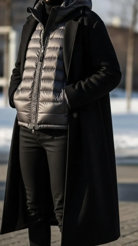 A compressible down jacket provides hidden insulation under a long coat. This keeps your shape smooth while staying warm. Pair with denim, trousers, or leggings. Add a scarf on windy days. Down jackets often appear in early-winter discounts.