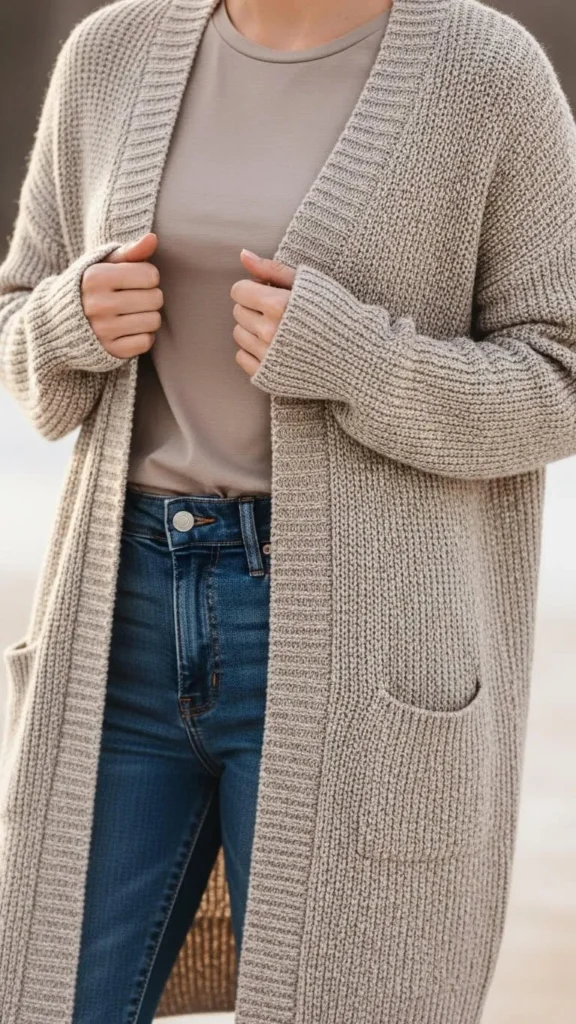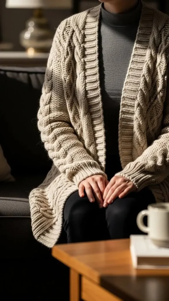 Chunky cardigans look stylish but sometimes feel heavy. Adding a thin base layer keeps you warm so you don’t need the thickest knit. Pair with jeans or leggings and add a long cardigan for a sleek shape. Thrift stores often carry soft knits that drape well.