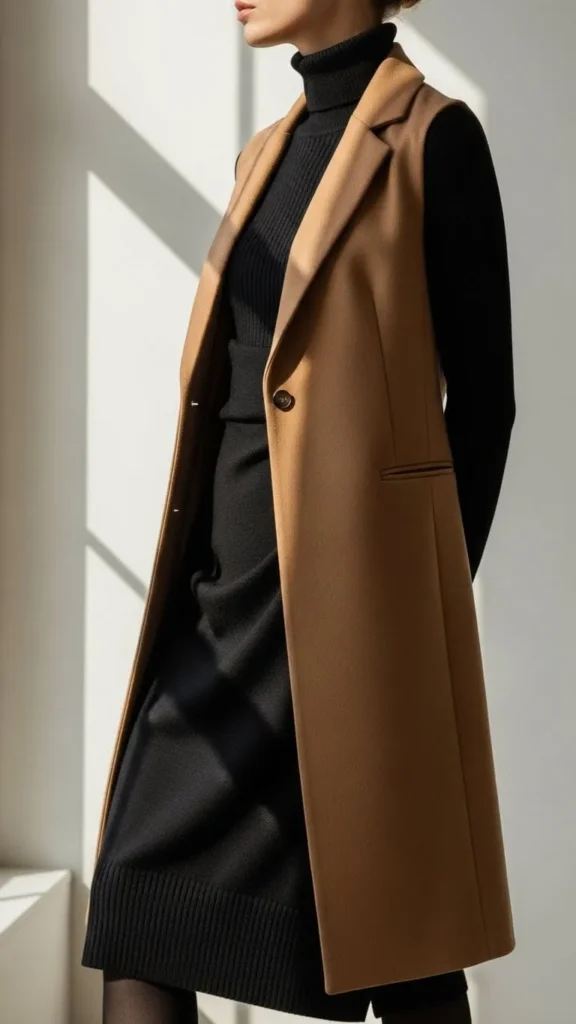 A turtleneck dress offers natural warmth, and a longline vest adds shape without bulk. Choose a vest that falls below the hip. Pair with tights and ankle boots. Add a thermal layer under the dress for colder days. Vests in neutral colours tend to match most outfits.