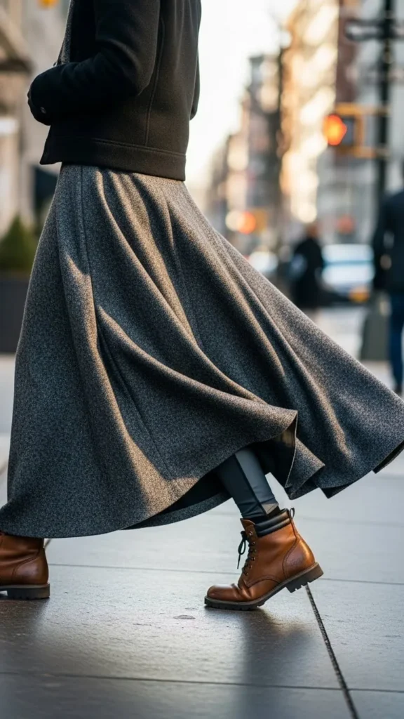 Maxi skirts work surprisingly well in winter when layered over heat-tech leggings. Choose thicker skirts like wool or ribbed knit. Pair with fitted tops and light jackets or cardigans. Add tall boots for more warmth. Heat-tech leggings are usually affordable and easy to find.