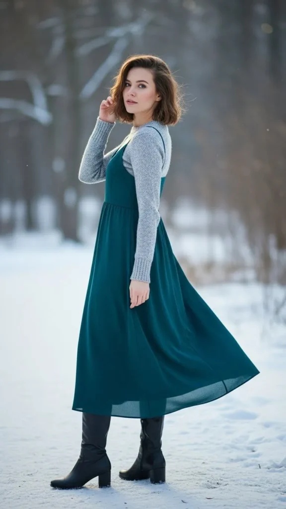 Layer a slim knit under a midi dress to make it winter-ready. This keeps the look long and smooth. Add tights and mid-calf boots for extra comfort. If the dress has a wider skirt, belt the waist for shape. Repurpose your summer dresses this way to avoid buying new items.
