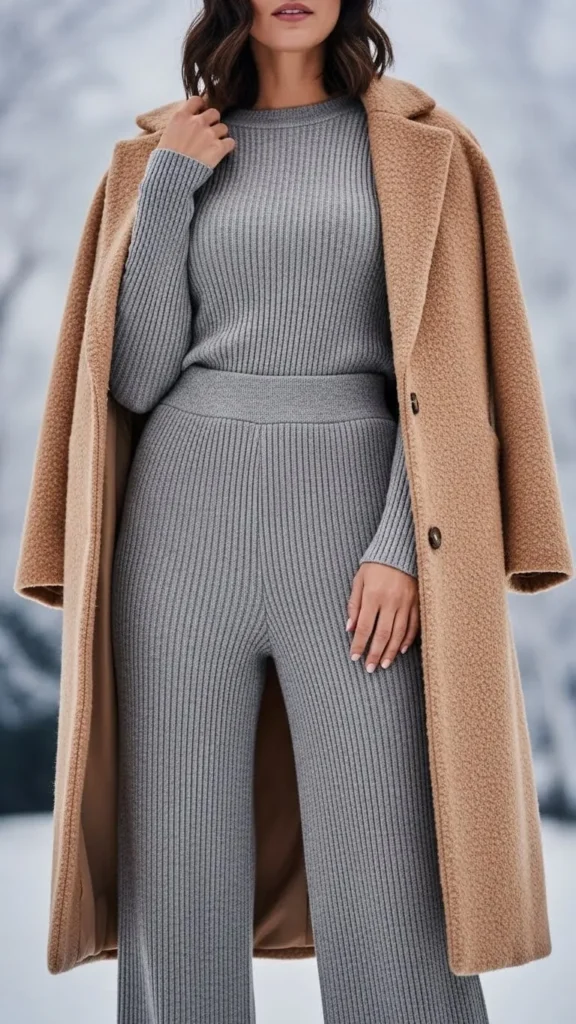 A ribbed knit set hugs the body gently, keeping warmth in. Layer with a soft coat for an easy winter outfit. Choose a coat in a contrasting tone for visual interest. Many knit sets are sold at low prices in neutral tones.