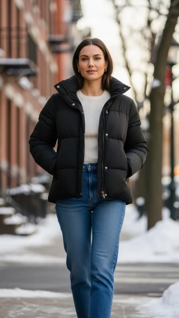 21. Short Puffer Jacket Over a Slim Knit and Straight Jeans