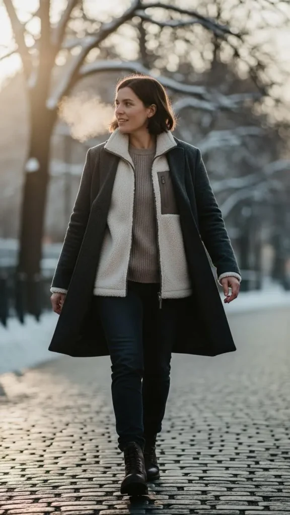 A fleece jacket acts as insulation and fits easily under a tailored coat. Choose a slimmer fleece so it lays well. Pair with denim or trousers. This combination suits commuting or winter walks. Activewear brands often sell thin fleece layers at budget-friendly prices.