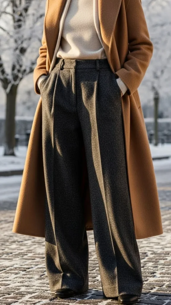 Wide-leg trousers look clean when paired with a fitted base layer. Add a draped soft coat to finish the outfit. Choose thicker trouser fabrics for windy days. Boots—flat or heeled—both work well. Wool-blend trousers are common during winter sales, making them easy to buy at lower prices.