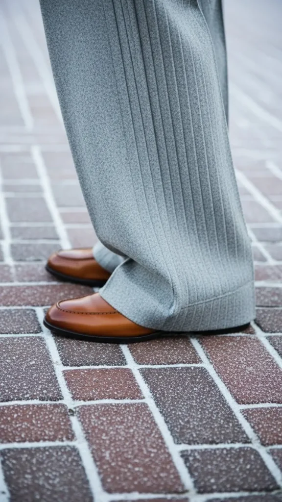 Wide-leg pants in wool feel modern and cozy. Your loafers peek from underneath, adding polish. Look for roomy wool pants at secondhand stores or affordable brands. Pair with a fitted turtleneck or button-up shirt. Skip expensive tailoring; a quick DIY hem adjustment at home can save money.
