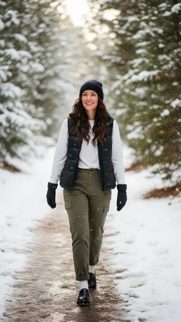Cargo pants add a utilitarian winter feel while still fitting into a loafer look. Pair with a simple white top and a puffer vest for warmth without overheating. This outfit is practical on chilly days. Shop affordable cargo pants from discount outlets or online sales.