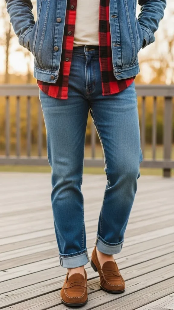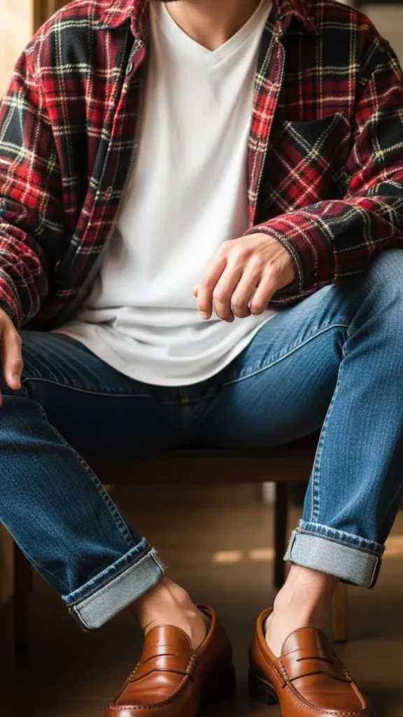 7. Loafers with Denim & Layered Flannel Shirts