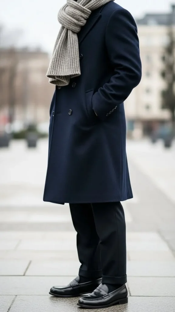17. Loafers with Double-Breasted Coat & Chunky Scarf