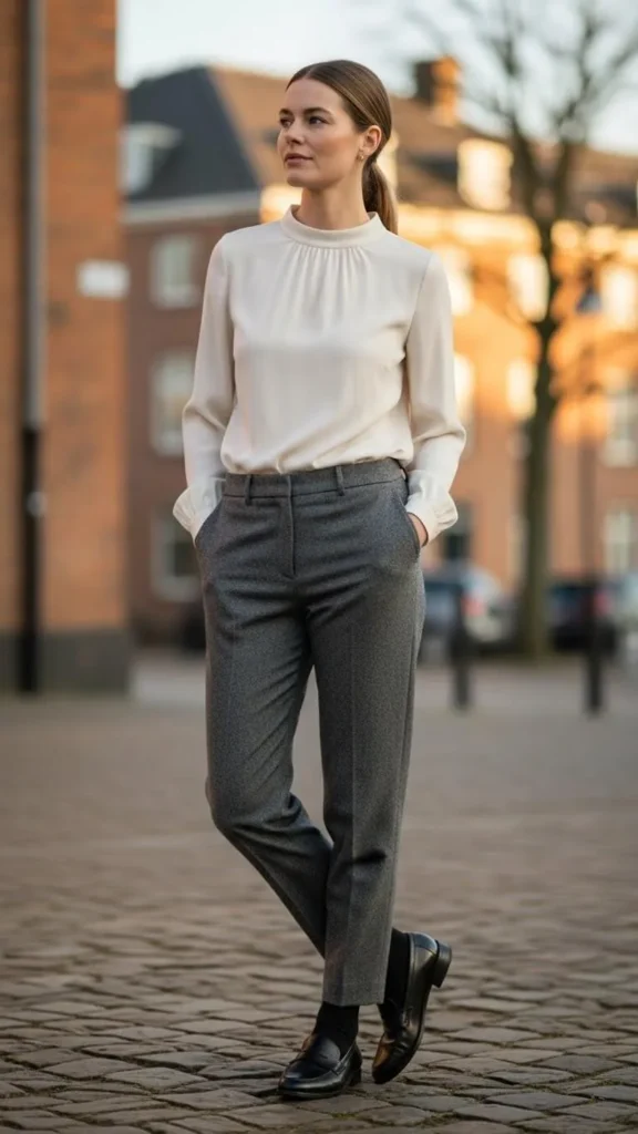 16. Loafers with Fitted Blouse & Wool Trousers