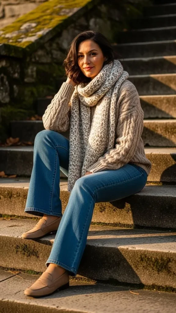 13. Loafers with Flared Jeans & Wool Scarf