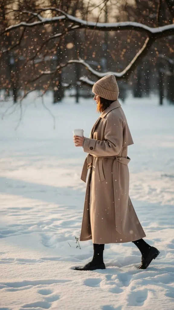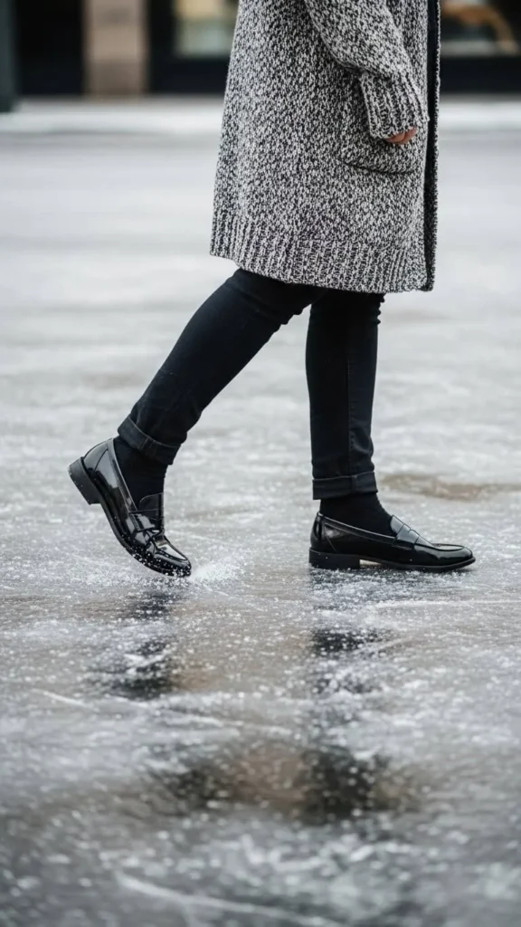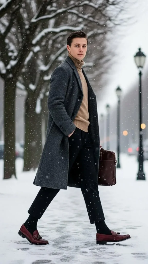 Keep it sleek with loafers, tapered trousers, and a wool coat. A fitted turtleneck adds warmth without bulk. This outfit works well for casual office days or weekend strolls. Look for secondhand wool coats—they can be gems at a fraction of the price. Choose loafers with weather-resistant soles for better grip on winter streets.