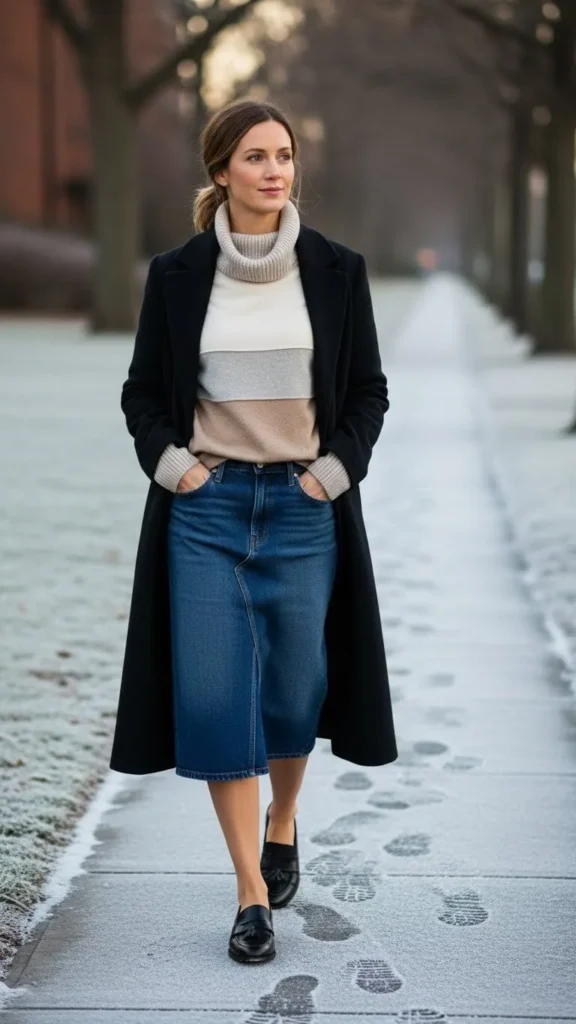 23. Loafers with Layered Turtlenecks & Denim Skirt