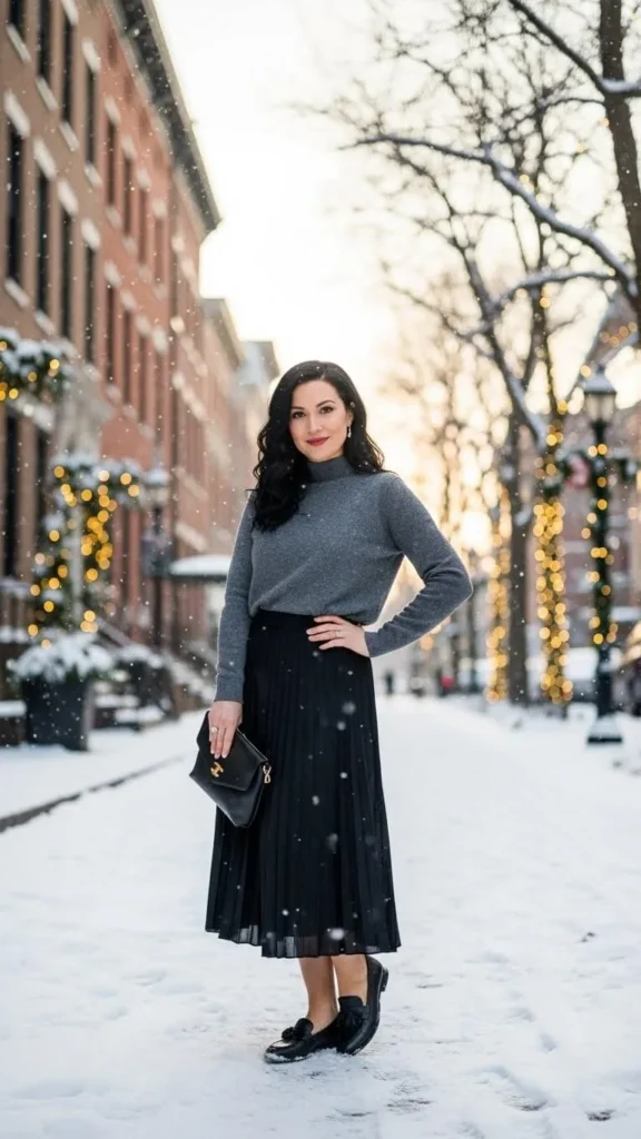 25. Loafers with Mock Neck Sweater & Pleated Midi Skirt