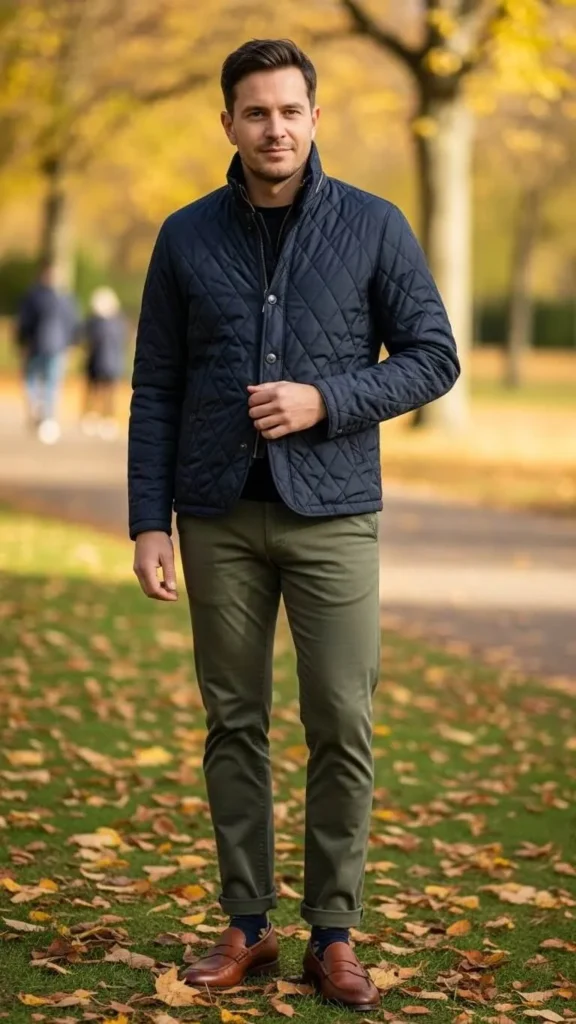 Quilted jackets give warmth without weight. Pair with chinos and loafers for sharp casual style. This outfit packs comfort and function.