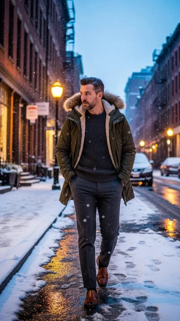 A faux fur-trimmed parka makes a statement, but keep the rest classic with loafers and simple knits. This style balances smart and cozy. Faux fur trim coats are often available on sale during winter clearance, helping with budgets.