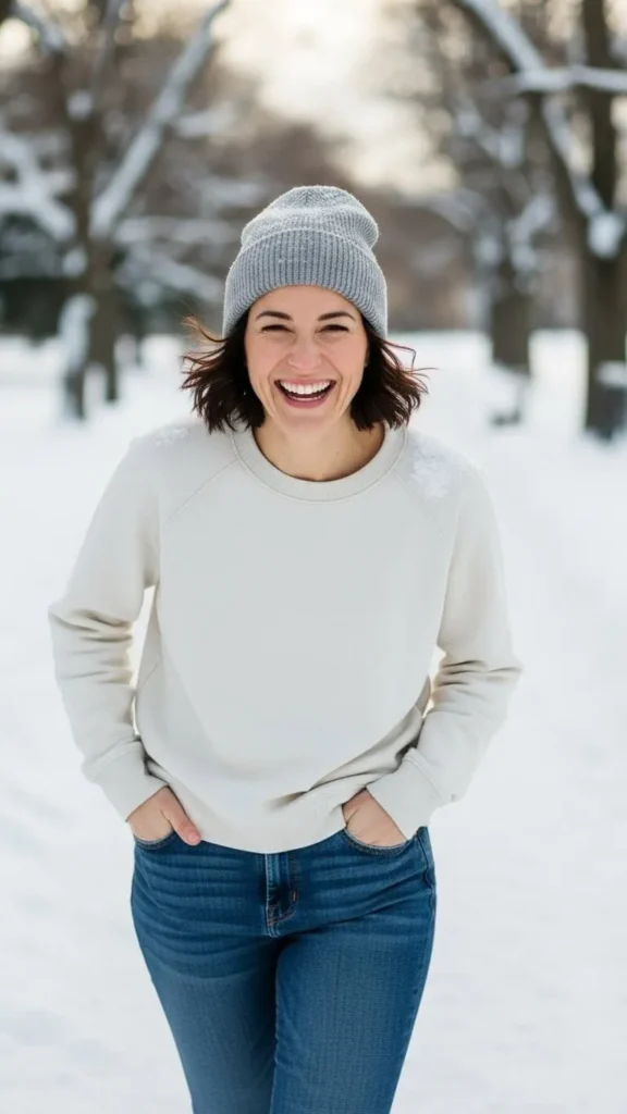 Budget tip: Look for thicker knits that hold shape. Add a scarf or necklace you already own. Clean sneakers or flat boots finish the outfit. This works well for errands or casual plans.