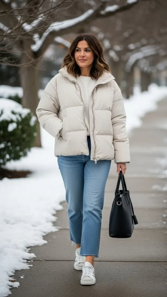 A puffer jacket keeps you warm fast. Pair it with straight-leg jeans for an outfit that feels balanced and easy. This combo works for errands, school runs, and casual workdays. Choose a jacket that hits mid-hip so you can move freely. Neutral colors make repeats simple.