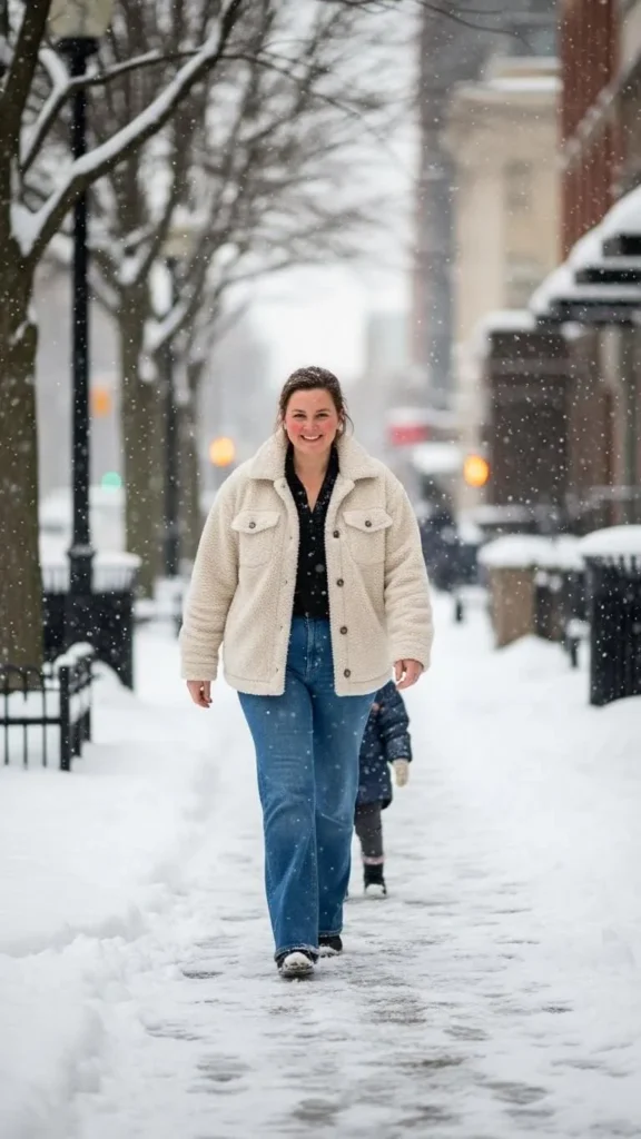 Sherpa jackets feel cozy and work well for cold mornings. Denim balances the texture.