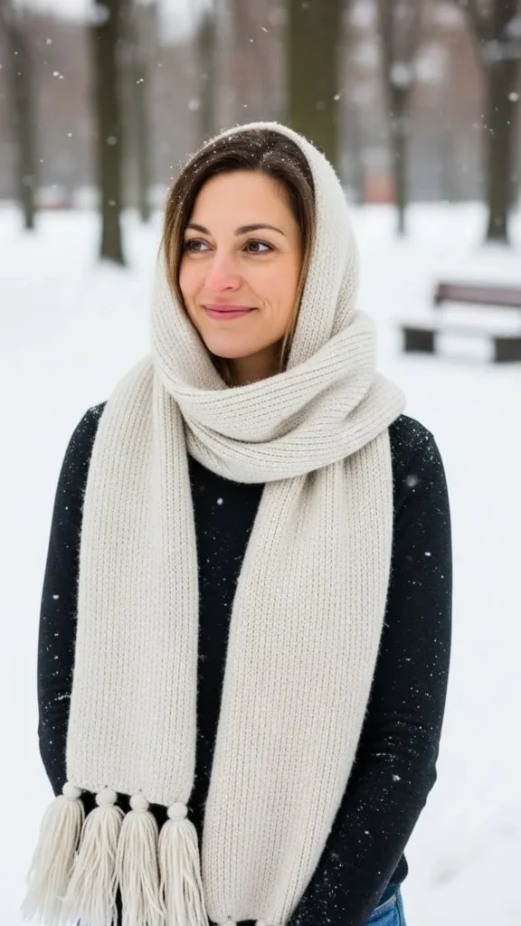 Scarves add warmth and visual interest. They work with basic layers.