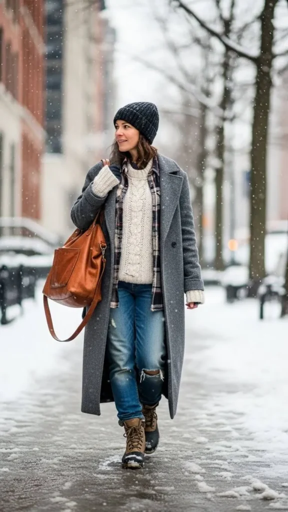 Ankle boots work with most winter outfits. They add comfort and grip.