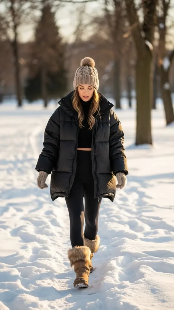 Leggings feel comfortable on cold days. A puffer jacket adds warmth fast. Choose a longer jacket for coverage. Neutral colors repeat easily. Add a beanie for extra warmth. Budget tip: outlet stores carry puffers at lower prices. Keep shoes practical. This outfit works for errands and outdoor walks.