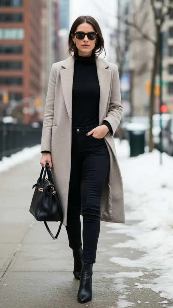 Start with black pants and a black top. Add a lighter coat on top. Beige, gray, or camel works well. This combo always looks clean. Texture keeps it interesting. Mix knits and denim. Budget tip: refresh black clothes with fabric dye if faded. Keep shoes simple. This outfit fits many settings. It saves time on rushed mornings.