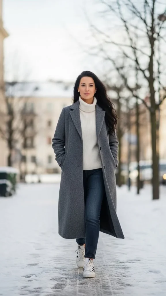A long coat adds structure. Sneakers keep things relaxed. Wear slim pants underneath. This contrast looks modern and comfortable. Budget tip: clean sneakers often. It changes the whole outfit. This look works for busy days on the go.