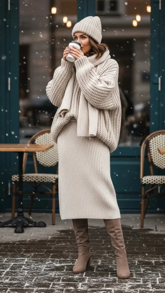 Wear gray from head to toe. Mix light and dark shades. Texture matters here. Knit tops with wool pants work well. Budget tip: mix fabrics you already own. This outfit feels calm and put together.