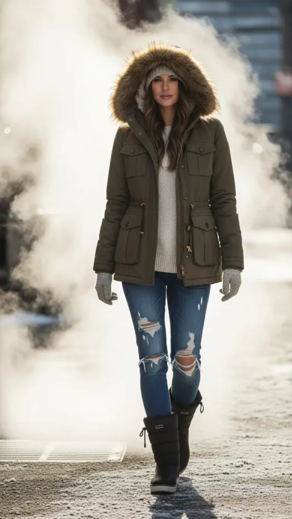 A utility jacket works for mild winter days. Layer over knits. Pair with jeans and boots. Budget tip: check men’s sections for sturdy jackets. This look feels relaxed and functional.