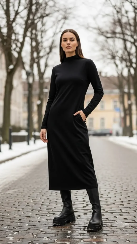 A simple black dress repeats easily. Chunky boots ground the look. Add tights for warmth. Thrift dresses often. This outfit works day or night.