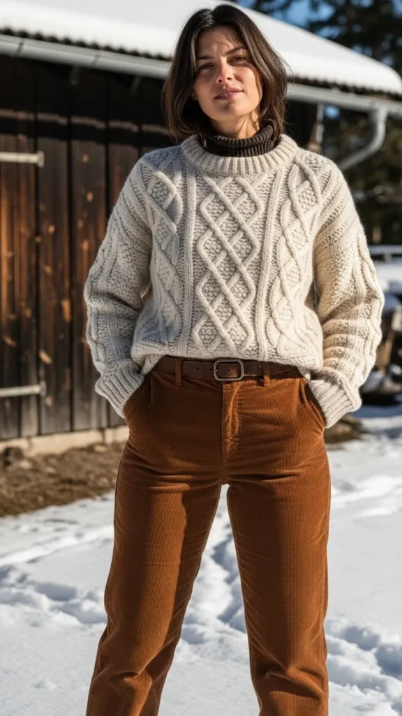Corduroy adds texture. Pair with a cable knit sweater. Neutral colors feel cozy. Thrift corduroy pants easily. This outfit suits cold weekends.
