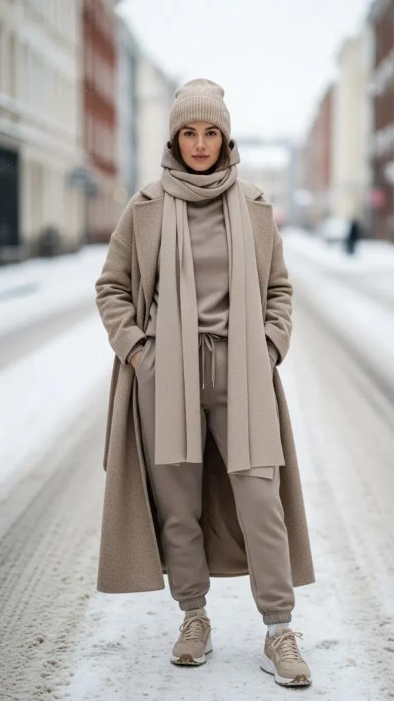 A matching tracksuit feels comfortable. Add a long coat to polish it. Keep colors simple. Budget sets cost less. This outfit works for travel days.
